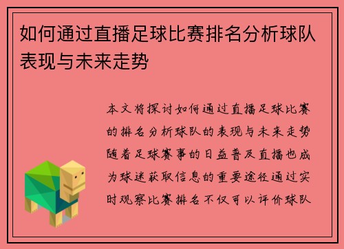 如何通过直播足球比赛排名分析球队表现与未来走势