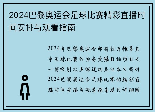 2024巴黎奥运会足球比赛精彩直播时间安排与观看指南